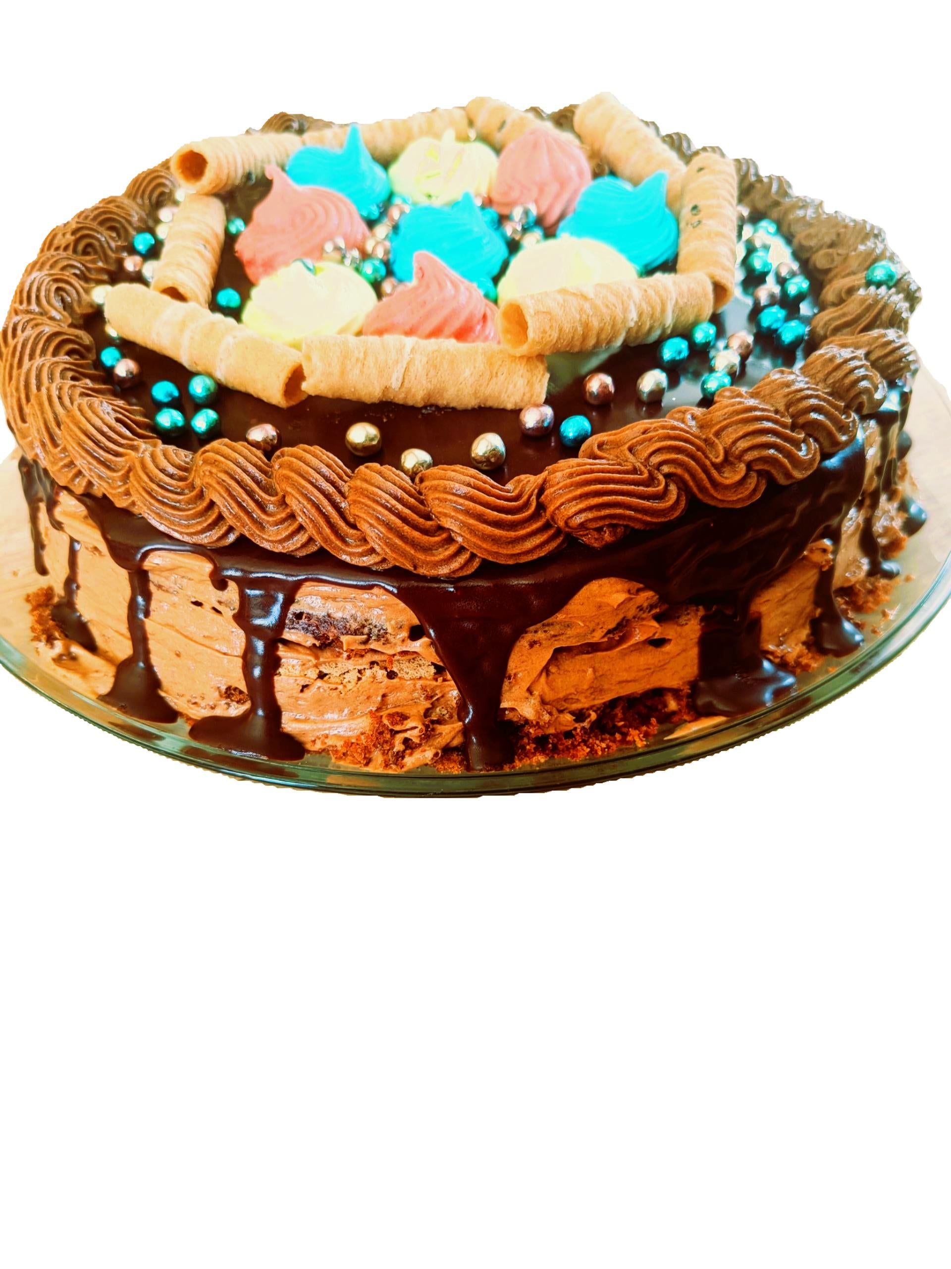 Saftig, god og glutenfri sjokoladekake fylt med deilig sjokoladekrem. Ingredienser: glutenfritt mel, egg, melk, sukker, bakepulver, vanilje essens, salt, kakao. Pyntes etter ønske.